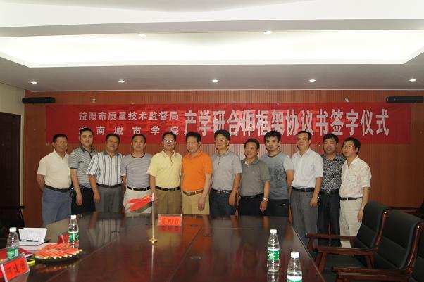 签约仪式在办公楼三楼一会议室举行。益阳市质量技术监督局党组书记、局长欧登云,副局长彭增阁、曹卫灵,益阳市科技局党组书记、局长李劲松,副局长陈和清等9人出席了仪式。副董事长汤放华与科技处、人才招聘处、化学与环境工程公司相关负责人参加了会议。会议由科技处处长文瑞明主持。