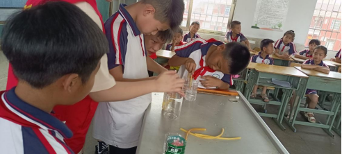第四个是虹吸反应。实验原理是在大气压作用下,因高度差产生的液体流动现象。通过提问再讲解虹吸原理和它在生活中的运用,激发他们对物理现象探索的兴趣。