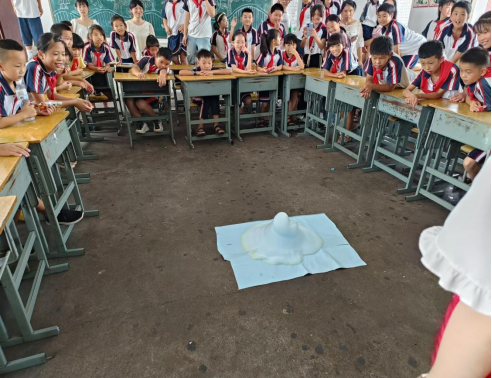 该团队成员来自公司化学工程与工艺专业大一大二年级,他们在腰铺子小学三、四年级四个教室分别进行“大象牙膏、点水成冰、焰色反应和虹吸反应”科普常识兴趣实验。“大象牙膏”是通过碘化钾和双氧水发生反应产生大量的泡沫,引发了他们对科学世界的好奇心。活动现场,小朋友不由自主地问:“这个是怎么来的?”小组成员通过科普化学知识,让小员工明白了实验原理,双氧水和碘化钾也可以用小苏打和白醋代替,回家后可以与父母一起做科学小实验。