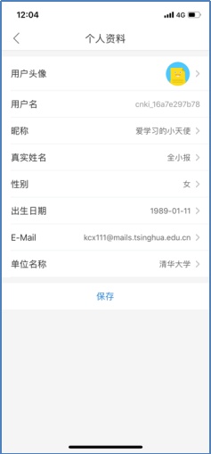 完成注册后,输入用户名和密码登录进入系统。点击头像图标,将必要的个人信息如实补充完毕,邮箱最好填机构邮箱,kcx111@mails.tsinghua.edu.cn,机构务必填写完整,如填北京大学而非“北大”,北京师范大学而非“北师大”,上海交通大学而非“上交大”,以便准确认证。知网将通过位置、IP、机构名称、姓名等信息,采用大数据分析方式认证用户的合法性。