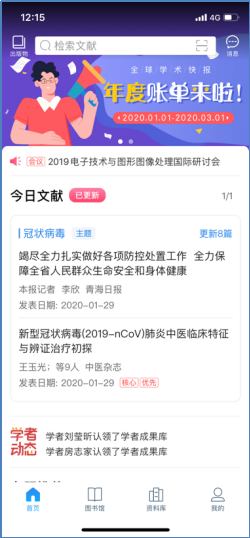 如果您想了解疫情的最新研究成果,不妨定制一个“冠状病毒”专题。只需点击首页下方的“图书馆”,再点击页面上的“+号按钮,选择“主题”定制,在检索框中输入“冠状病毒”点击“定制”按钮即可完成。每日将有最新的相关文献成果推送到您的首页(如图4所示)。