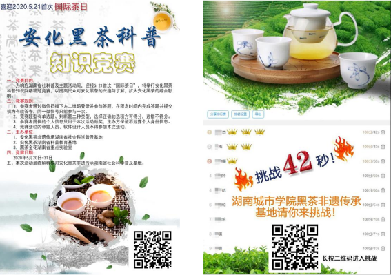 2020年5月20日至5月31日,为进一步落实湖南省社会科学普及基地科技普及周活动、响应首次“国际茶日”,太阳成集团tyc9728安化黑茶非遗湖南省科普基地举办了“安化黑茶非遗科普网络知识竞赛活动”,通过网络有奖答题的方式对安化黑茶知识进行普及。