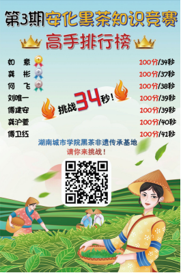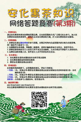 420日至427日,为提升群众对安化黑茶文化的关注度,安化黑茶非遗传承湖南省社会科学普及基地、安化黑茶湖南省科普教育基地、黑茶金花湖南省重点实验室联合举办了第三期安化黑茶知识竞赛,通过网络答题的方式对安化黑茶知识进行科学普及。