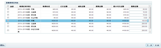 5. 选择缴费内容后,在页面正中将出现详细的缴费信息,除老生缴纳学费、住宿费可自行填报缴费金额外,重修费、考试费等项目必须按照收费标准全额缴款;新生必须一次性交清全部项目。