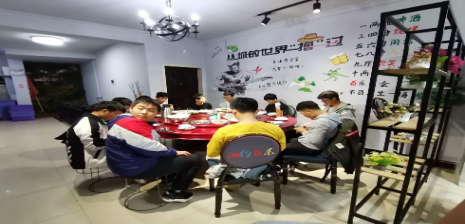 军训结束后大家相约去湘约筷乐餐馆聚餐,班干提前一周去预订好了座位和菜品,大家围着热气腾腾的饭菜谈笑风生,一边享受着舌尖上的美味,一边分享着军训以来的收获,大家忆军训军姿的苦,思军训后收获满满的甜,现场洋溢着热情融洽、朝气蓬勃的气氛。而后,教官发言,带我们体会人民解放军方正、认真、上进、坚毅、朴素的风貌,万众一心、上下同心的人际关系,充实而富有正能量的精神生活。由此大家对人民解放军的强大深有所感,由此观之,军训还能强化我们的爱国情感,我们心中都洋溢着对人民解放军浓浓的敬畏之情军训带给大家的不仅仅是一段永远珍贵而难忘的记忆,更是彼此间,与教官间深厚而真挚的情谊。天下没有不散的宴席,但是我们之间的感情是永恒的。聚餐结束后大家又一起来到电影院再次深刻体会爱国精神,观看了电影《八佰》,观影过程中有不少同学都被爱国战士们的英勇无畏所感动,不禁潸然泪下。