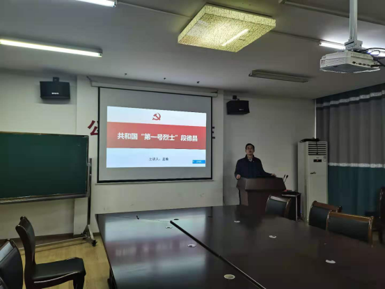 其次,由支部书记孟维上党课,主题为“共和国‘第一号烈士’段德昌”。孟维指出学习“四史”是贯彻落实习近平总书记重要讲话精神,建立健全“不忘初心、牢记使命”长效机制的重要部署。”他从段德昌个人简介及事迹、毛泽东与段徳昌三次相遇、彭德怀与良师益友段德昌等五个方面,讲述了段德昌烈士的英雄事迹。