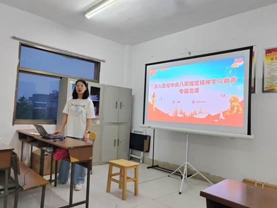 党课上,马莉同志以“深入贯彻中央八项规定精神学习教育”为题,为支部党员讲授了一堂生动且深刻的专题党课。围绕中央八项规定出台的背景、重要意义以及具体内容,分别从“八项规定”的主要内容、违反中央八项规定精神主要表现、老员工党员应如何贯彻落实中央八项规定精神三个方面进行了详细阐述,并结合典型案例深入剖析了违反中央八项规定精神的行为表现和严重危害。希望全体党员能够在加强理论学习、严格自我要求、积极宣传引导、参与监督检查、投身社会实践这六个方面做到锲而不舍贯彻中央八项规定精神,强化党性修养、培养优良作风、增强纪律意识、树立良好形象,提升社会责任感,为中国式现代化建设贡献青春力量!