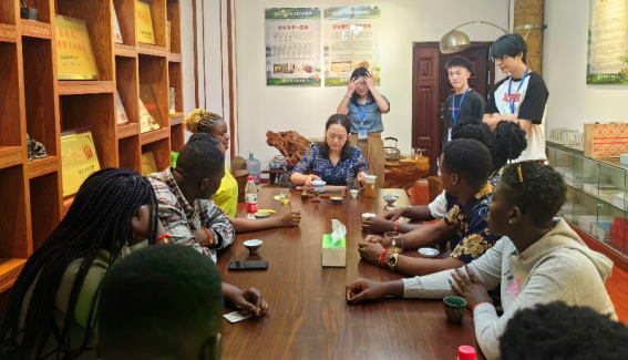 姚教授从中国茶的起源、历史发展、中国茶艺、中国茶道等方面向加纳国际交流生介绍中国茶文化,并针对饮茶器具、茶叶泡饮方式、中国茶叶品类等与员工积极互动。