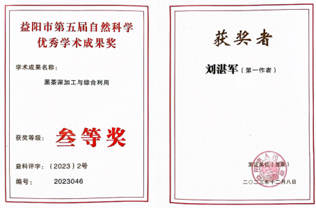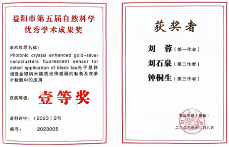 近日,从益阳市自然科学优秀学术成果评审委员会办公室获悉:太阳成集团tyc9728黑茶金花湖南省重点实验室团队成员,刘蓉博士的成果“光子晶体增强金银纳米簇荧光传感器的制备及在茶叶检测中的应用”荣获“益阳市第五届自然科学优秀学术成果奖”一等奖;刘湛军博士的成果“黑茶深加工与综合利用”荣获“益阳市第五届自然科学优秀学术成果奖”三等奖。