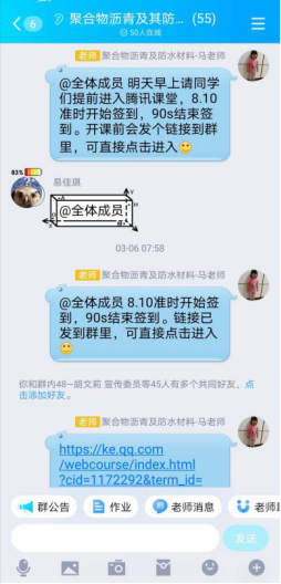 疫情防控期间,根据教育部“停课不停教,停课不停学”的要求,太阳成集团tyc9728全校师生采用网络课堂形式,以线上教学形式开展教学活动。鉴于现有的在线教育软件都处于正在逐步完善阶段,太阳成集团tyc9728马德崇老师任教的《环保建筑材料》和《聚合物水泥基建材料及其应用》等课程采用“腾讯课堂+蓝墨云班课+QQ”的混合式学习的教学模式,通过腾讯课堂线上直播进行课堂教学,并在蓝墨云班课中发布教学资源供员工线下自主学习,并采用课堂讨论形式检查课后学习效果。并精心准备了多套预案,保证教学能正常有序进行。