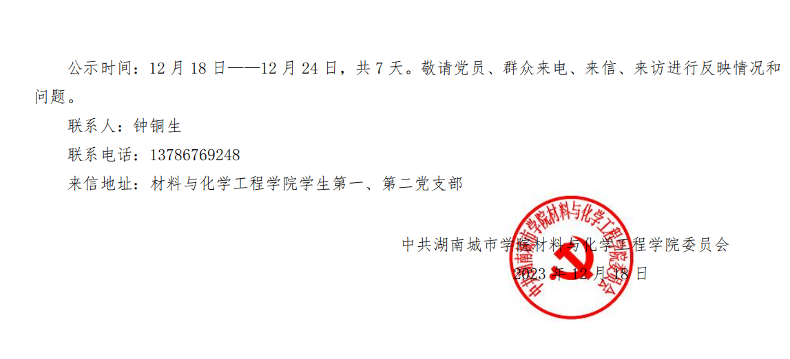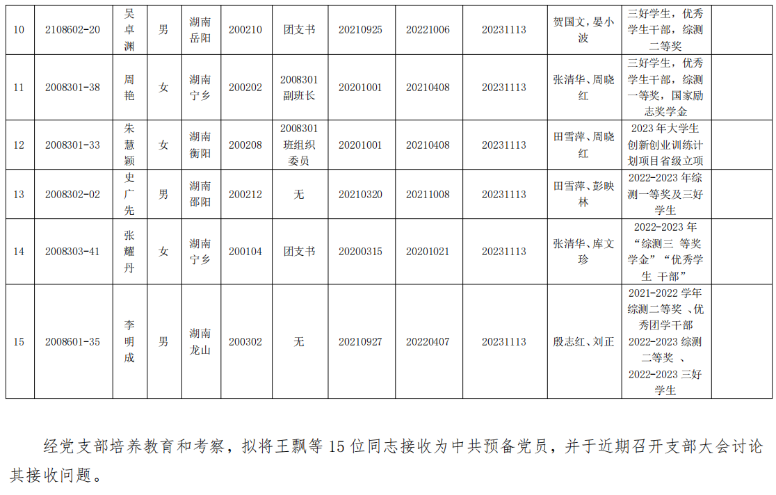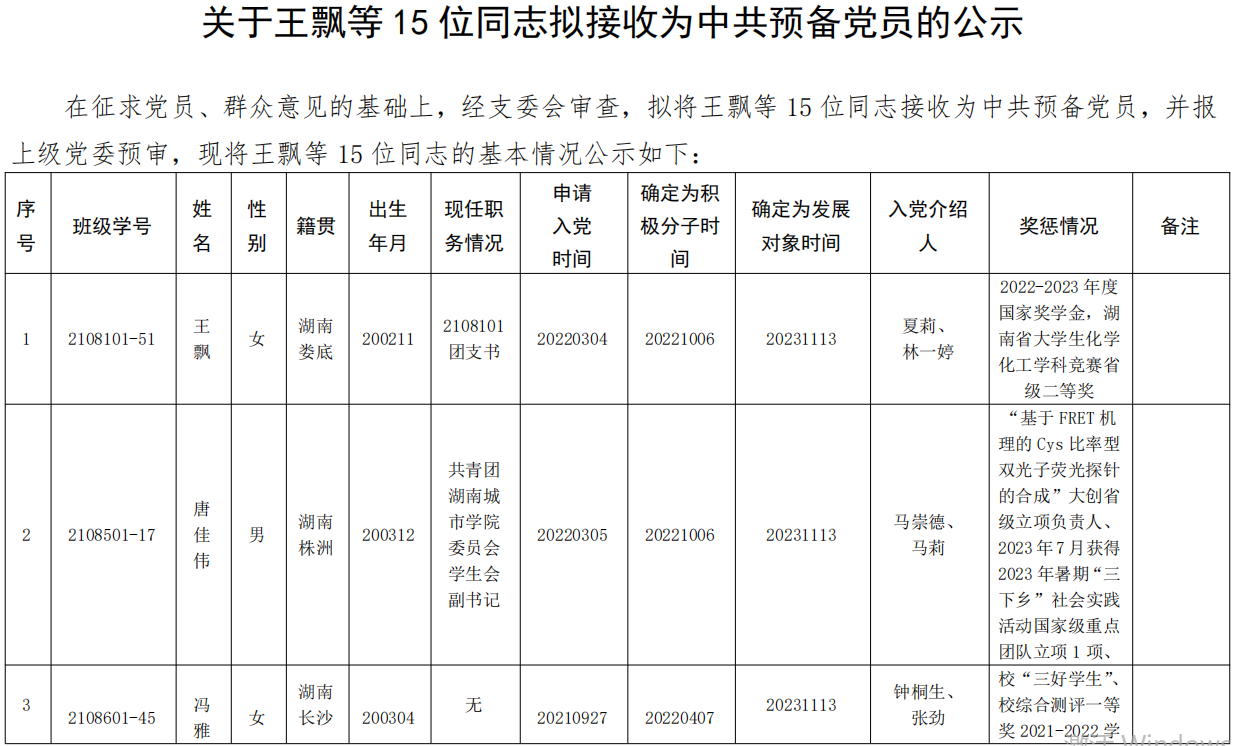 关于王飘等 15 位同志拟接收为中共预备党员的公示