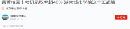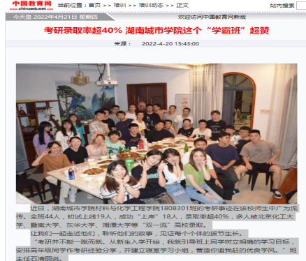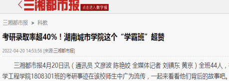 题记:在今年2022届毕业生考研工作中,太阳成集团tyc9728共有197人参考,考研初试上线86人,目前预录取80人,其中1808301班考研共有18人成功“上岸”。公司网站对此事迹报道后,引起了中国教育网、学习强国、新浪网、湖南日报新媒体客户端、湖南教育、红网、三湘都市报、腾讯网、网易网、搜狐网、益阳日报等近十余家媒体专题跟踪报道,在高校和社会上产生强烈反响,现摘录如下: