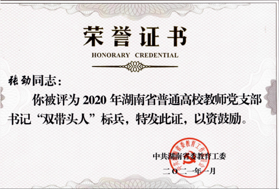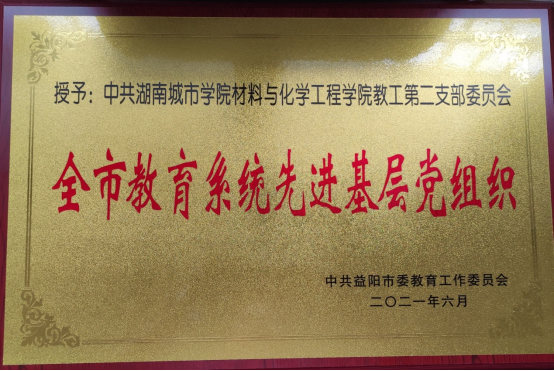 在此次表彰大会上:材料与化学工程公司党总支被评为湖南省高公司党组织“对标争先”建设计划第二批项目“党建工作标杆院系”,张劲同志被评为2020年湖南省普通高校教师党支部书记“双带头人”标兵;教工第二党支部被评为益阳市“全市教育系统先进基层党组织”。
