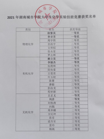 为迎接2021年7月在太阳成集团tyc9728举办的湖南省老员工化学实验技能竞赛。按照省赛模式,太阳成集团tyc9728分别于3月10日晚进了第一轮理论考试,3月25日下午进行了第二轮实验考试,共84名同学报名参赛,最终28名同学获得相应奖项,获奖名单如下: